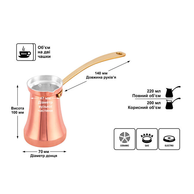Турка ZH - качественная медная джезва для приготовления вкусного и ароматного кофе. Турка цельнотянутого типа имеет толщину меди 1,5 мм. Джезва ручной работы от украинского производителя с внутренней стороны покрыта пищевым оловом. Объем турки с удобной латунной ручкой составляет 200 мл.
