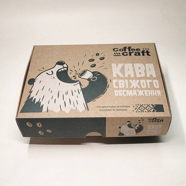 Подарунковий набір містить 5 сортів кави у фасуванні по 100 г + стікерпак. Набір упакований у брендовану коробку з крафтового картону щільністю 400 г/м².