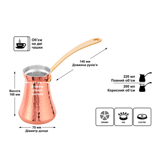 Турка ZH - якісна мідна джезва для приготування смачної й ароматної кави. Турка суцільнотягнутого типу має товщину міді 1,5 мм. Джезва ручної роботи від українського виробника з внутрішньої сторони покрита харчовим оловом. Об`єм турки зі зручною латунною ручкою становить 200 мл.